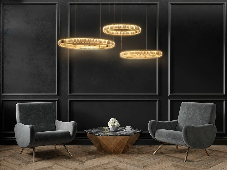 Kryształowe szkło zamocowane po obu stronach obręczy w niezwykły sposób rozprasza strumień światła.