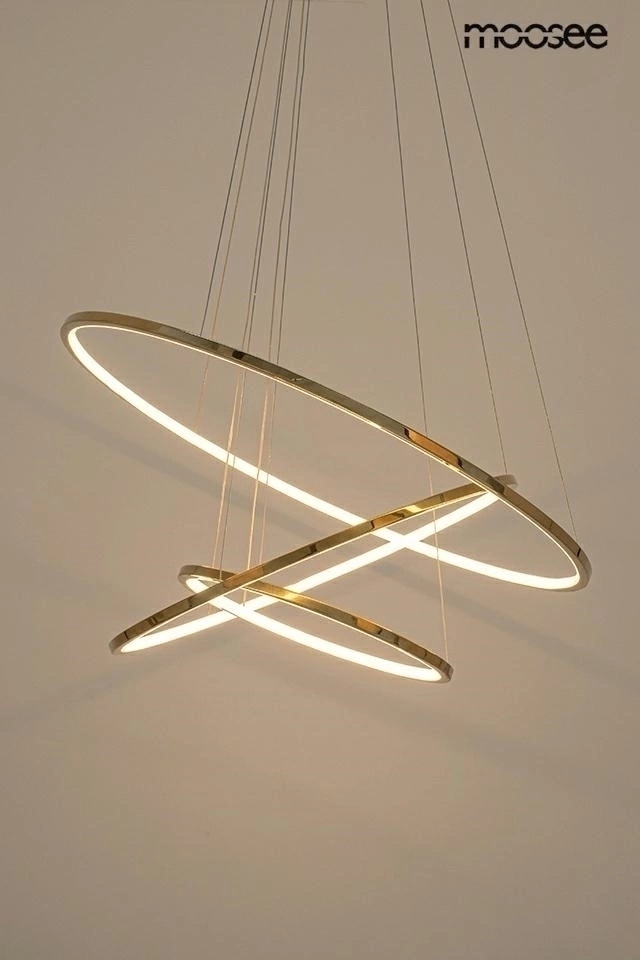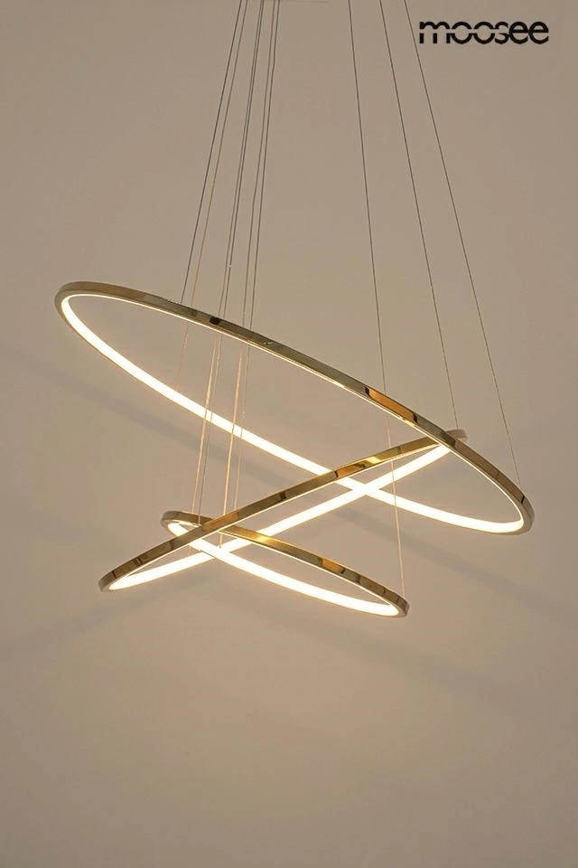MOOSEE lampa wisząca RING SLIM S złota. Ponadczasowa estetyka połączona z minimalistycznym designem, te słowa doskonale opisują piękno oprawy Ring Slim. Całość składa się z 3 okręgów, które można powiesić kaskadowo bądź w dowolnej konfiguracji co pozwala w pełni dopasować lampę do swoich potrzeb. Ringi wykonano ze stali w połyskującym złotym kolorze, a źródła światła z akrylu. Lampa Ring Slim to będzie wspaniały wybór dla osób, które cenią sobie najwyższą jakość i współczesny styl. Dostępne różne konfiguracje, rozmiary oraz pojedyncze wersje. Światło: LED 50 W / 4000 lm / 3000 K Oprawa: wys. 192 cm / szer. 80 cm / gł. 80 cm Klosz: wys. 1,5 cm / śr. 80 , 60 , 40 Mocowanie: wys. 4,5 cm / śr. 25 cm Przewód: 190 cm Montaż: instalacja sufitowa Waga netto: 5,9 kg Wymiary opakowania: 87 cm / 87 cm / 10 cm.