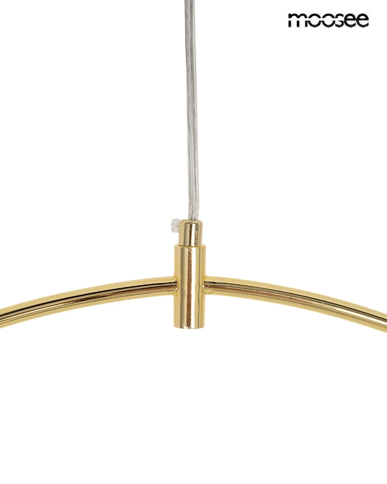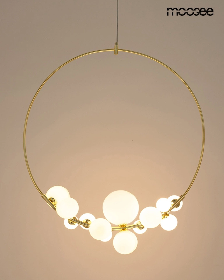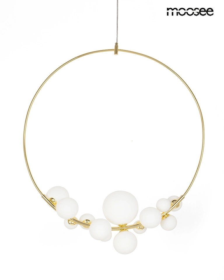 Lekka, złota konstrukcja tworzy delikatną obręcz, na której osadzone są matowe, białe klosze o kulistym kształcie.