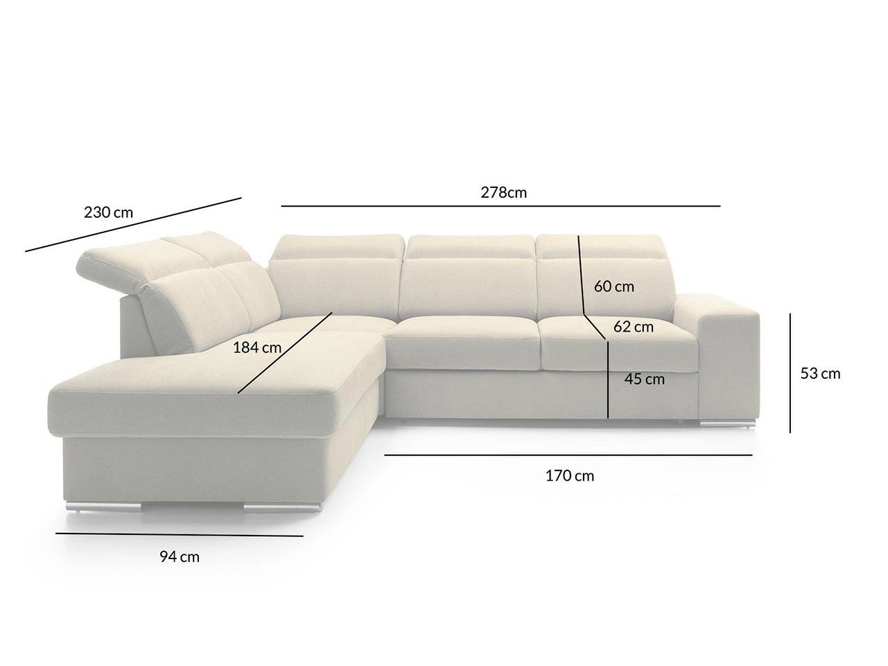 Wymiary: wys. 105 cm / szer. 278 cm / gł. 94 cm