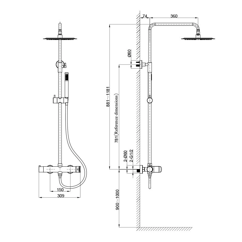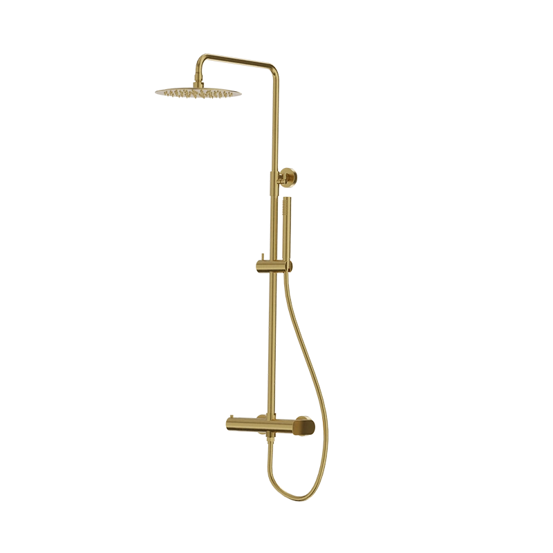 Kolor:Złoto szczotkowane:5:0, Materiał :Mosiądz:6:0, Rączka prysznicowa mosiężna:Tak:95:0, Wąż prysznicowy, długość (cm):150:96:1, Deszczownica z ramieniem, rozmiar, zasięg do ściany (mm):ŚR.250, 434:97:1, Regulowana wysokość, Min/Maks wysokość syste