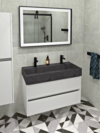 Seria NIRONA w połączeniu z ceramicznymi umywalkami KARE ma proste i czyste kształty. Szuflady są bezuchwytowe, wyposażone w systemy BLUM z funkcją hamowania BLUMOTION z dożywotnią gwarancją.