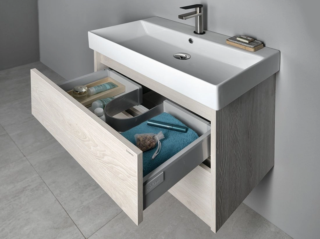 Seria NIRONA w połączeniu z ceramicznymi umywalkami KARE ma proste i czyste kształty. Szuflady są bezuchwytowe, wyposażone w systemy BLUM z funkcją hamowania BLUMOTION z dożywotnią gwarancją.