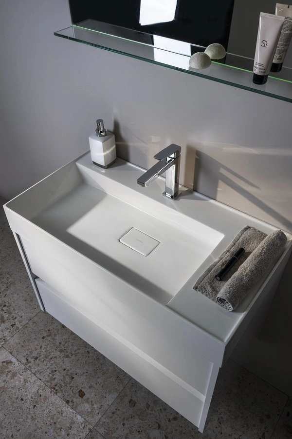 Seria NIRONA w połączeniu z ceramicznymi umywalkami KARE ma proste i czyste kształty. Szuflady są bezuchwytowe, wyposażone w systemy BLUM z funkcją hamowania BLUMOTION z dożywotnią gwarancją.