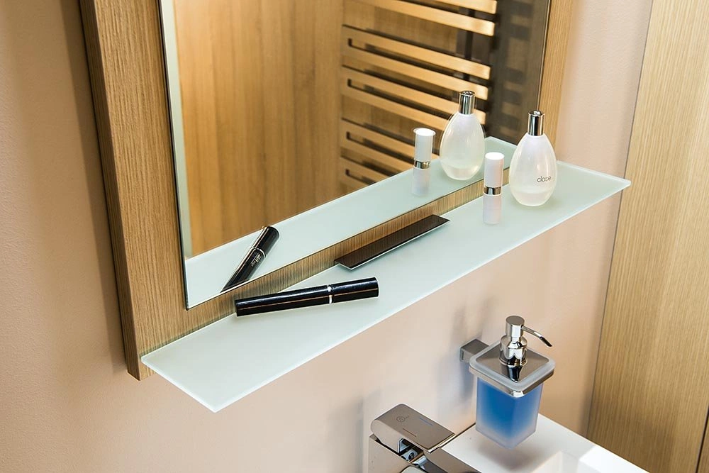 Lustra NIROX można wykonać w dowolnym dekorze, dzięki czemu może być częścią jakiejkolwiek aranżacji stworzonej z mebli marki SAPHO. Dodatkowo możesz wyposażyć w półkę z uchwytami z naszej oferty.