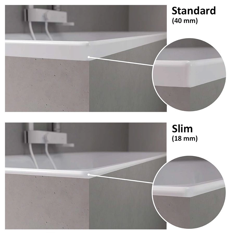 Wanny akrylowe w wersji SLIM mają w porównaniu z innymi wannami niższą krawędź, jej wysokość wynosi tylko 18 mm. Przy zabudowaniu płytkami wyglądają bardziej estetycznie. Nie można instalować z obudową wannową.
