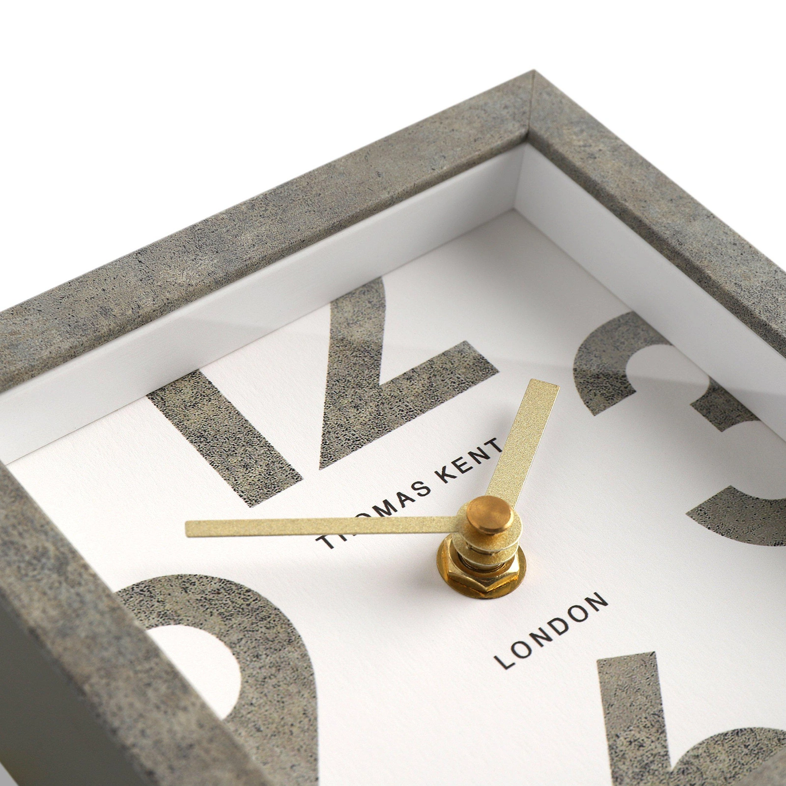 The Nordic mantel clock is characterized by its minimalist and functional design, embodying the clean and timeless aesthetic of Scandinavian style. Its crisp white dial features bold, out-of-proportion numerals, adding a unique flair to the clock's face. The square timepiece is wrapped in a matte grey-green, providing a modern touch. A stone texture extends between the numerals and the facing edge, creating depth and curiosity in the overall design. The gold hands of the clock add a touch of elegance. The Nordic mantel clock is an ideal living room or bedside table accessory.