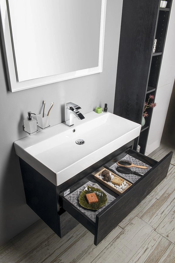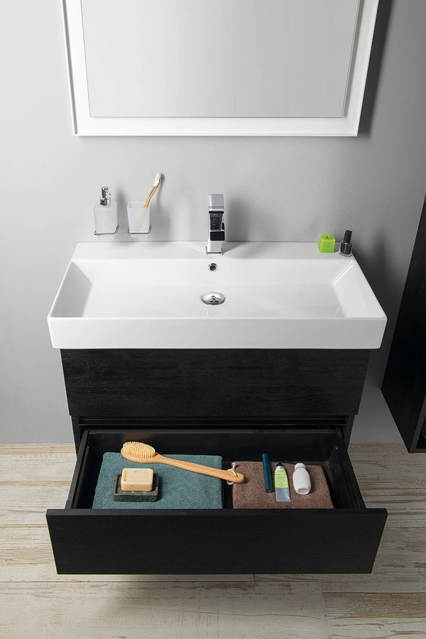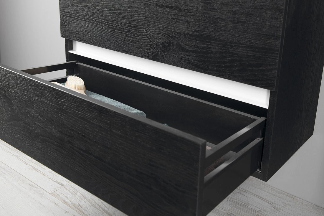 Szuflady z bezuchwytowym otwieraniem wyposażone są w pojazdy BLUM z systemem hamowania i cichego domykania. Górna szuflada nie ma wycięcia na syfon, tym samym oferuje wiekszą przestrzeń do przechowywania rzeczy.