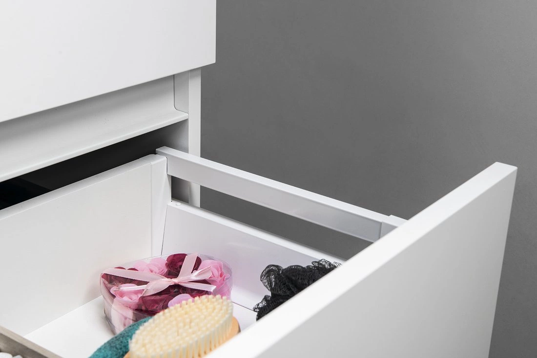 Szuflady z bezuchwytowym otwieraniem wyposażone są w pojazdy BLUM z systemem hamowania i cichego domykania. Górna szuflada nie ma wycięcia na syfon, tym samym oferuje wiekszą przestrzeń do przechowywania rzeczy.