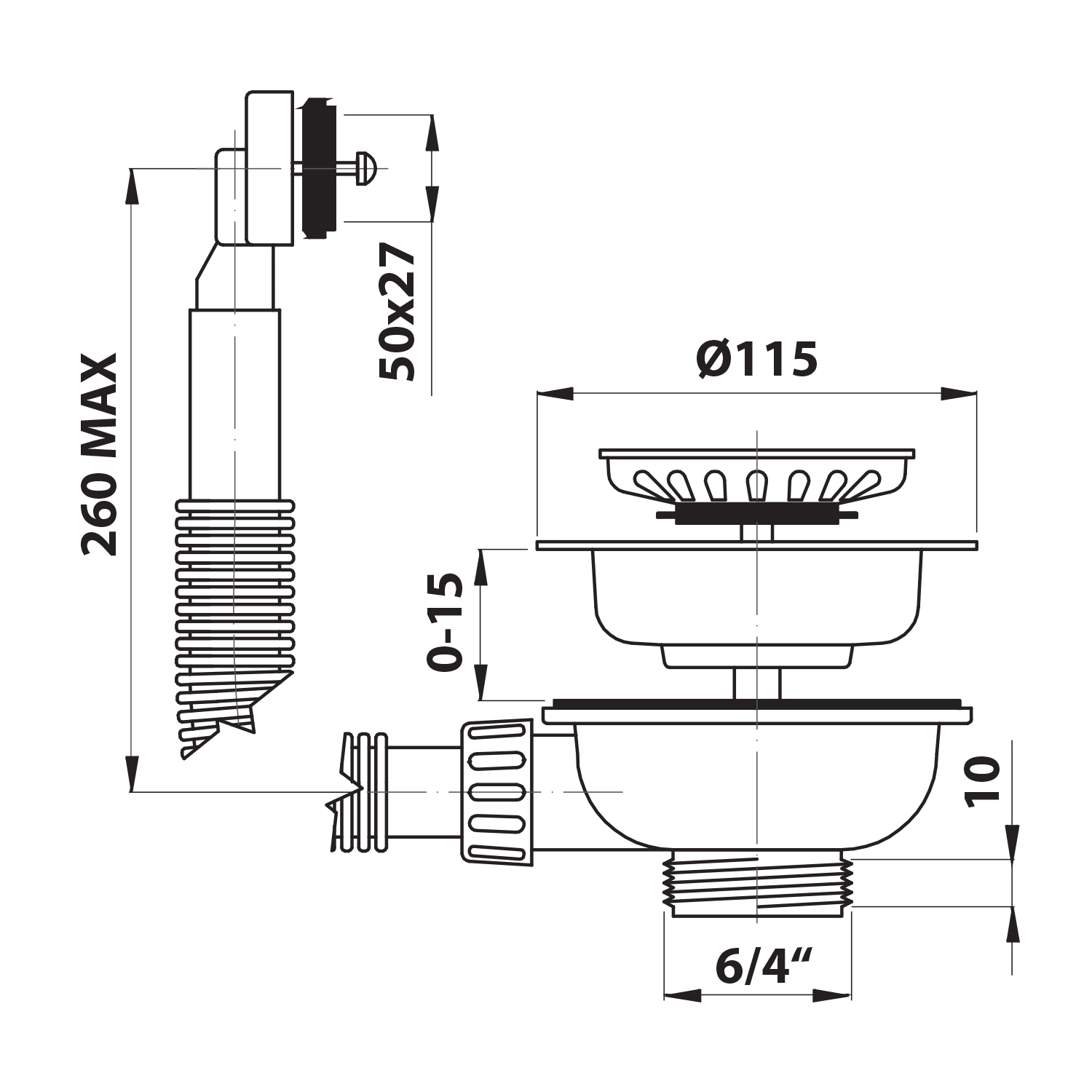 Odpływ zlewozmywakowy 6/4", z przelewem, stal nierdzewna
