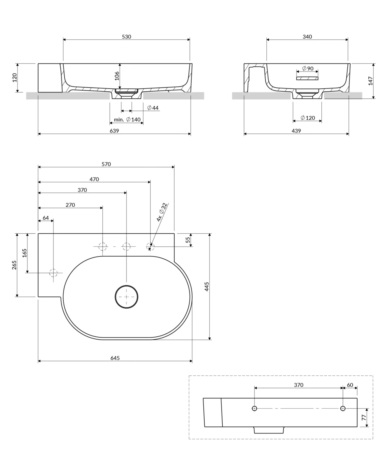 OVO M+ | umywalka nablatowa/wisząca - lewa, 64 x 44 cm