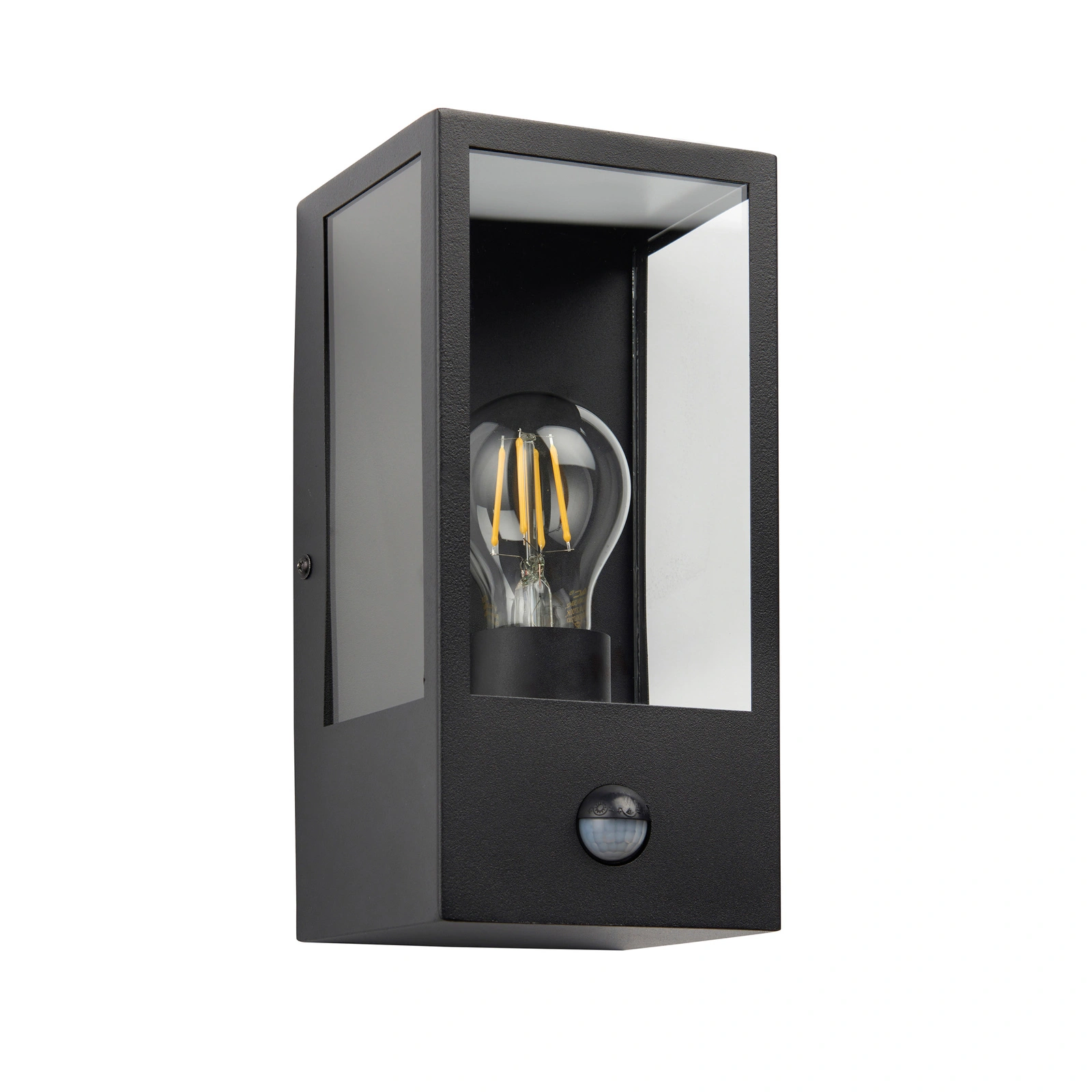 A timeless and classic style outdoor wall light, fashioned as a box lantern with sleek matt black painted stainless steel edges and bevelled edge glass panels. 10-2000 lux and 110º detection, this is IP44 rated for safe exterior use and perfectly pairs with E27 filament lamps. With built-in manual override for the functional motion sensor, with an adjustable 5 sec - 5 min timer function. The perfect addition to complement today's exterior architecture.