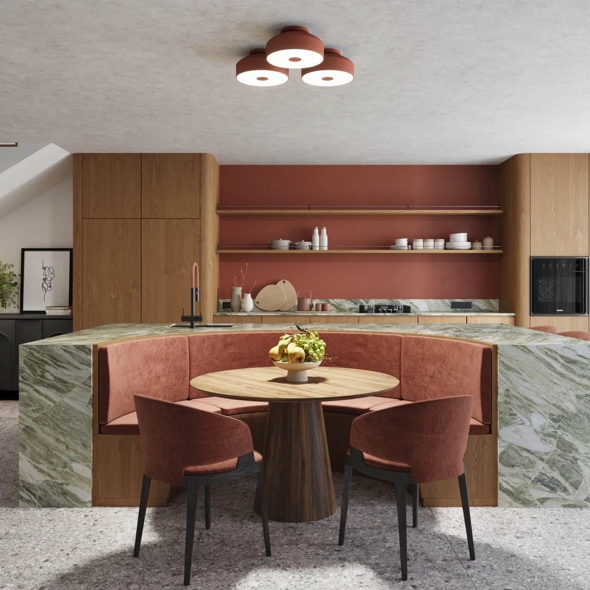 OMIQ to lampa sufitowa, która łączy prostotę z wyjątkowym designem. Jej zaokrąglony, miękki kształt i matowe wykończenie sprawiają, że z łatwością wpisuje się w każde wnętrze – od minimalistycznych aranżacji po bardziej odważne, kolorowe przestrzenie.
