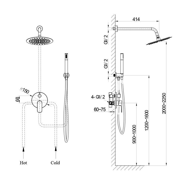 Kolor:Szczotkowana miedź:5:0, Materiał :Mosiądz:6:0, Wąż prysznicowy, długość (cm):150:96:1, Deszczownica z ramieniem, rozmiar, zasięg do ściany (mm):śr 250, 414:97:1, Przyłącze kątowe mosiężne z uchwytem na rączkę prysznicową:Tak:98:0