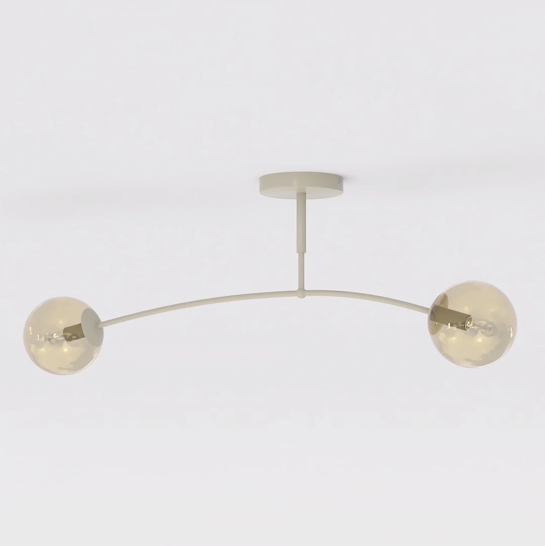 Lampa sufitowa PREGOS wyróżnia się wyrafinowanym, nowoczesnym designem z elegancką, łukowatą konstrukcją wspierającą cztery szklane klosze w kształcie kul. Jej zbalansowane, wielokierunkowe oświetlenie i dopracowana estetyka sprawiają, że jest to idealny, funkcjonalny punkt centralny do współczesnych salonów, sypialni lub jadalni.