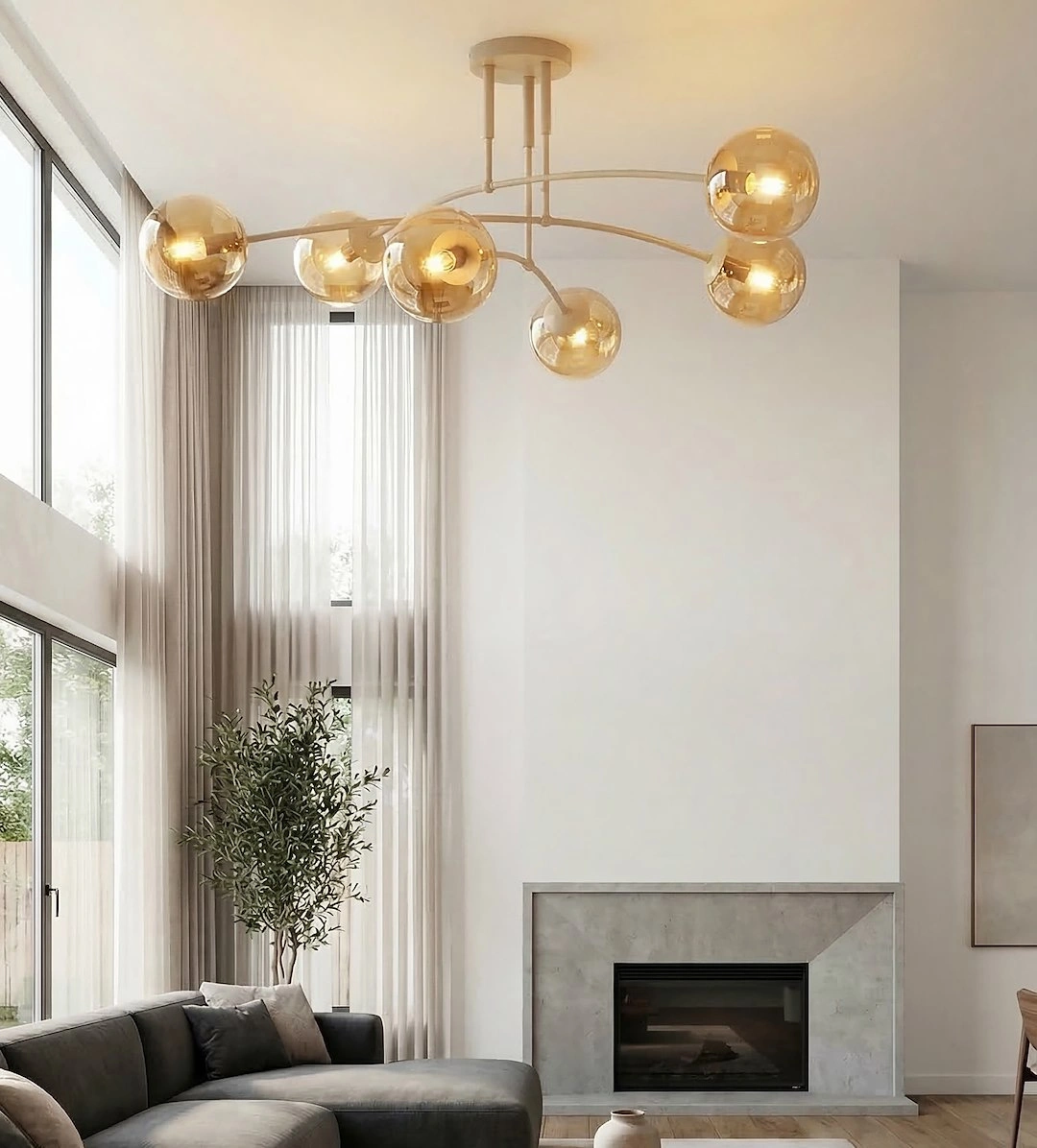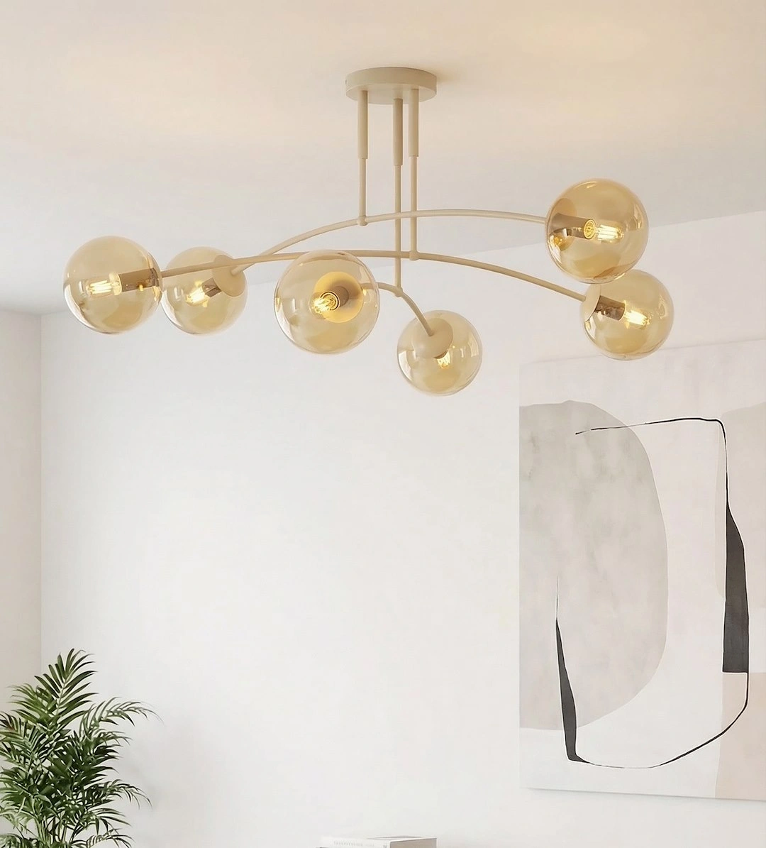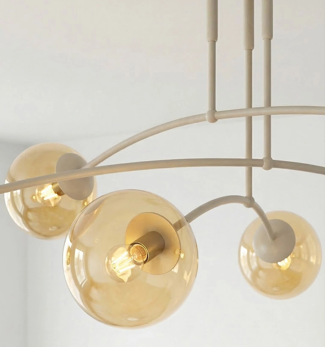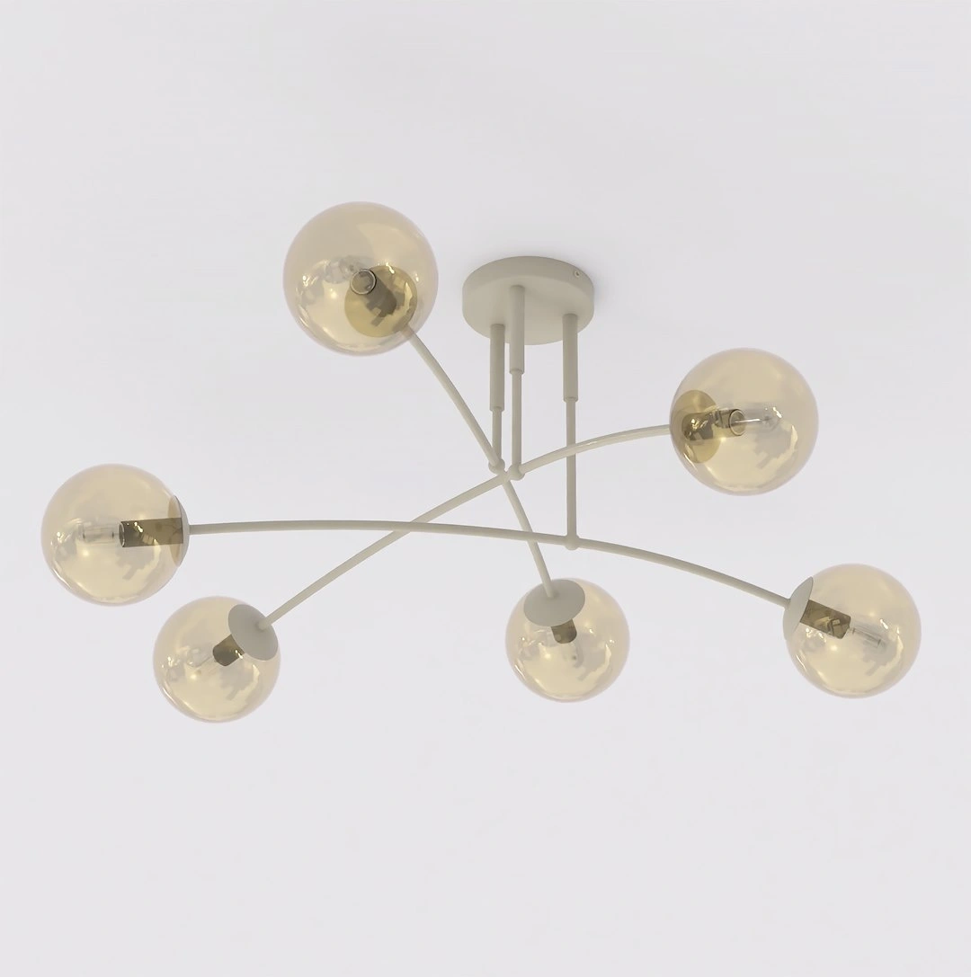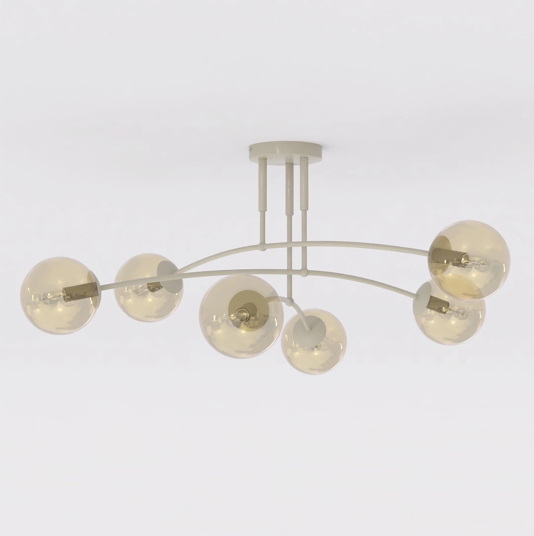 Lampa sufitowa PREGOS wyróżnia się wyrafinowanym, nowoczesnym designem z elegancką, łukowatą konstrukcją wspierającą cztery szklane klosze w kształcie kul. Jej zbalansowane, wielokierunkowe oświetlenie i dopracowana estetyka sprawiają, że jest to idealny, funkcjonalny punkt centralny do współczesnych salonów, sypialni lub jadalni.