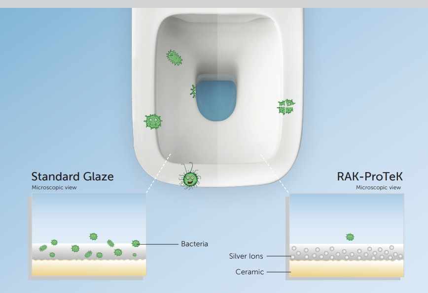 Antybakteryjna powłoka chroniąca w 99,9% przed bakteriami, ułatwiająca czyszczenie ceramiki.