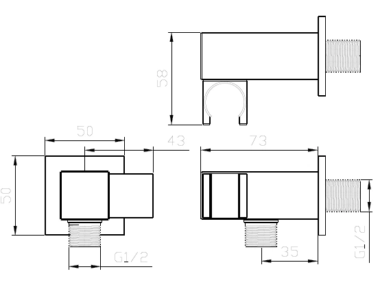- Wymiary: rozeta 50×50 mm, długość korpusu 73 mm, wysokość 58 mm, odległość do uchwytu 43 mm, dolne przyłącze wysunięte na 35 mm.
