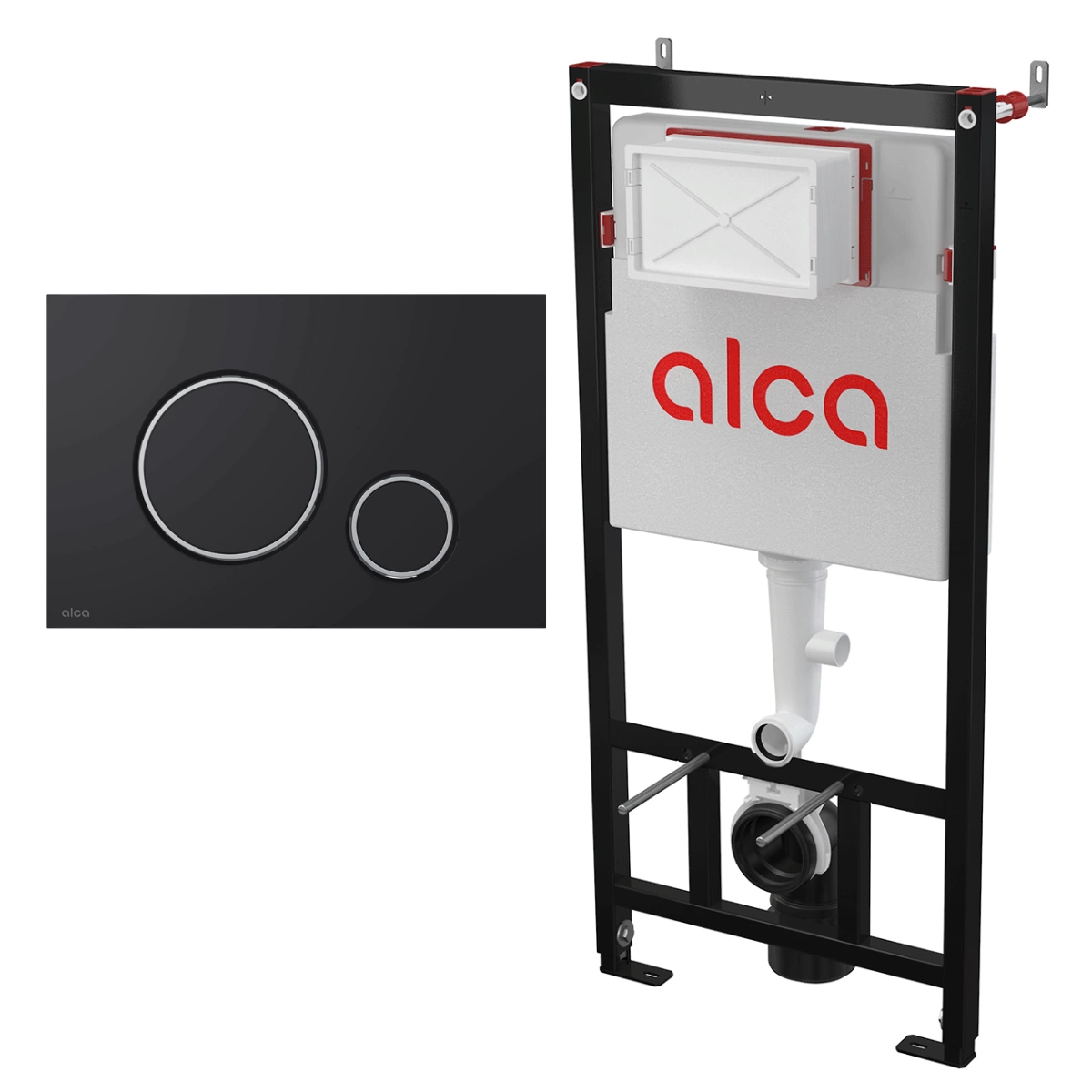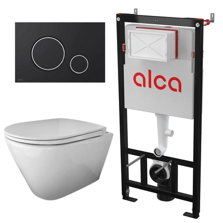 RAK Ceramics RESORT Miska WC podwiesz. Rimless 52x36 cm biały połysk ze stelażem i przyciskiem THIN Czarny mat/ Chrom połysk Alcadrain