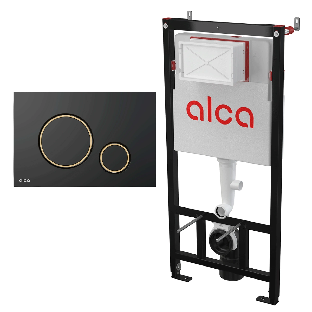 RAK Ceramics RESORT Miska WC podwiesz. Rimless 52x36 cm biały połysk ze stelażem i przyciskiem THIN Czarny mat/ Złoty połysk Alcadrain