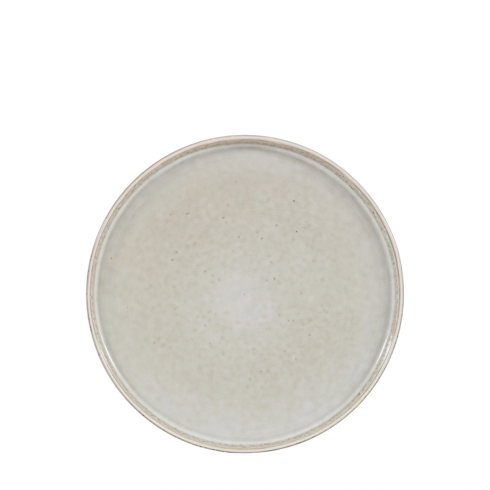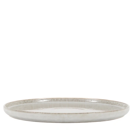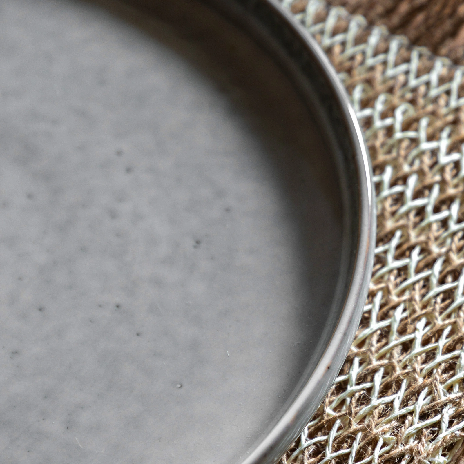 Set of 4 dinner plates with reactive pale grey glaze. The organic looking glaze has natural variation in colour and tone, adding a rustic, handmade style charm to the set.
