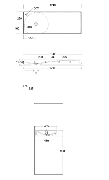 REMAL Umywalka podwieszana & nablatowa 121 x 46 cm R blat z prawej strony z otworem na baterię MICA WHITE