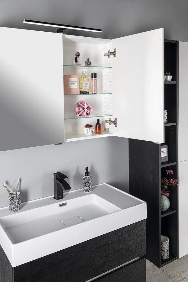 Szafka z lustrem RIWA zapewnia wystarczającą przestrzeń do przechowywania kosmetyków czy golarki. Duże lustro, które schowa każdy drobiazg, na pewno pokochasz. W szafce znajduje się gniazdko i oświetlenie LED podłączone do zewnętrznego wyłącznika. Na zamówienie może szafka zostać wyposażona w senzor bezdotykowy. W połączeniu z półkami RIWA z naszej oferty powstaje szeroka gama oryginalnych zestawów, dzięki czemu możesz stworzyć oryginalne wnętrze (z wyjątkiem szafki z lustrem o szerokości 80 cm).