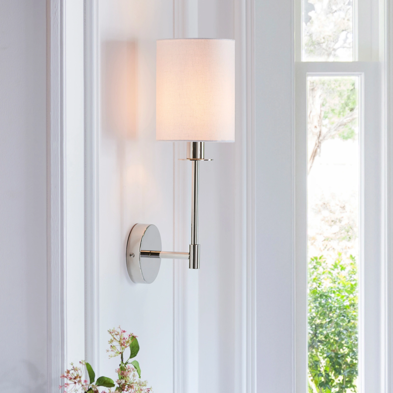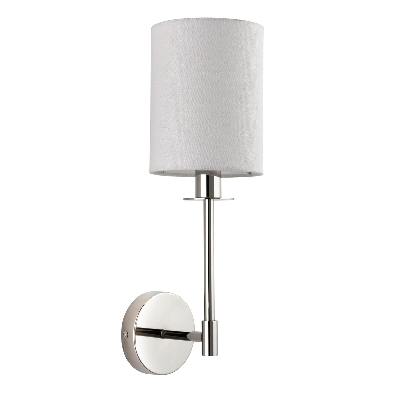 A simple and easy to place modern classic style wall light. Finished in polished nickel with vintage white fabric shade.