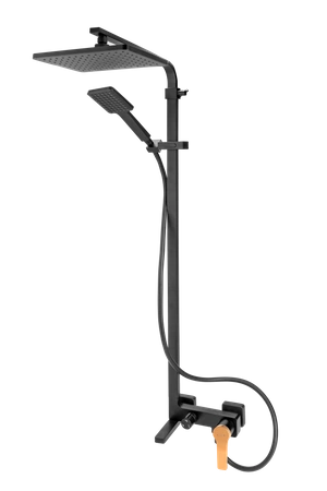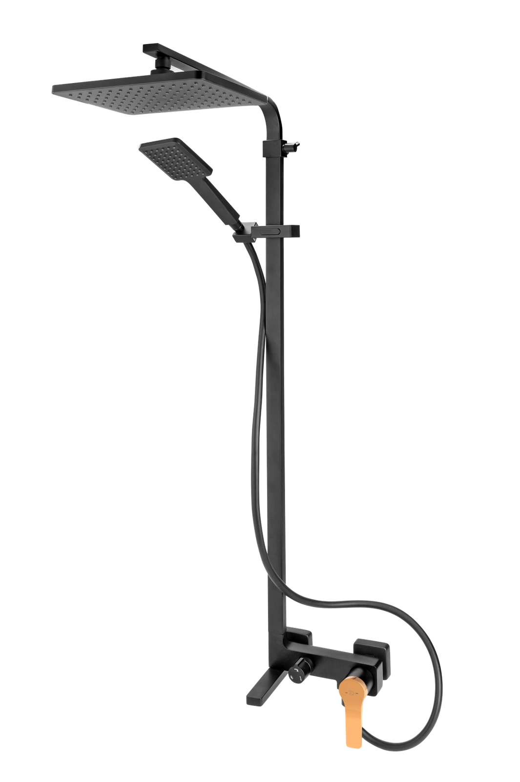 Zestaw jest wspaniałą propozycją do łazienek urządzonych z pomysłem, w których spotkamy ciekawe rozwiązania kolorystyczne. Idealnie zaprezentuje się w nowoczesnych aranżacjach w towarzystwie armatury z tej samej kolekcji. Świetnie odnajdzie się również we wnętrzach urządzonych w stylu glamour. Oryginalna barwa – połączenie matowej czerni z różowym złotem podkreśla geometryczną formę poszczególnych elementów i nadaje szyk strefie kąpieli. Regulowana wysokość deszczowni pozwala na dostosowanie jej do natrysku lub wanny. Niezwykle praktycznym rozwiązaniem jest wylewka baterii wannowej, którą można wygodnie złożyć zyskując tym samym większą przestrzeń użytkową. Funkcjonalność i elegancki, niepowtarzalny design – to najważniejszej zalety zestawu.