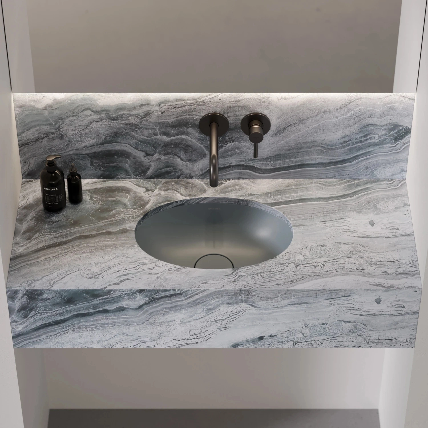 Umywalka podblatowa z kolekcji OMNIRES SHELL M+ charakteryzuje się współczesną eliptyczną formą, która miękką linią zwęża się ku podstawie. Jej kompaktowe wymiary czynią ją idealnym wyborem do małych łazienek i toalet. Precyzyjnie zaprojektowana konstrukcja rantu umożliwia montaż umywalki pod blatem, tworząc jednolitą, spójną powierzchnię. Alternatywnie, umywalkę można zamontować wpuszczając ją w blat, pozostawiając jedynie minimalistyczny rant na powierzchni. Oba rozwiązania montażowe nie tylko ułatwiają codzienną pielęgnację, ale także optymalnie wykorzystują przestrzeń, czyniąc umywalkę idealnym wyborem dla aranżacji, gdzie liczy się każdy detal i maksymalne wykorzystanie dostępnego miejsca.
