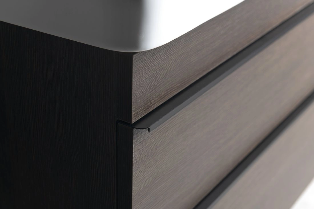 Minimalistyczne meble SITIA wyakcentowane subtelnym uchwytem na całej długości frontów w połączeniu z umywalką THALIE tworzą naprawdę ponadczasowy zestaw.