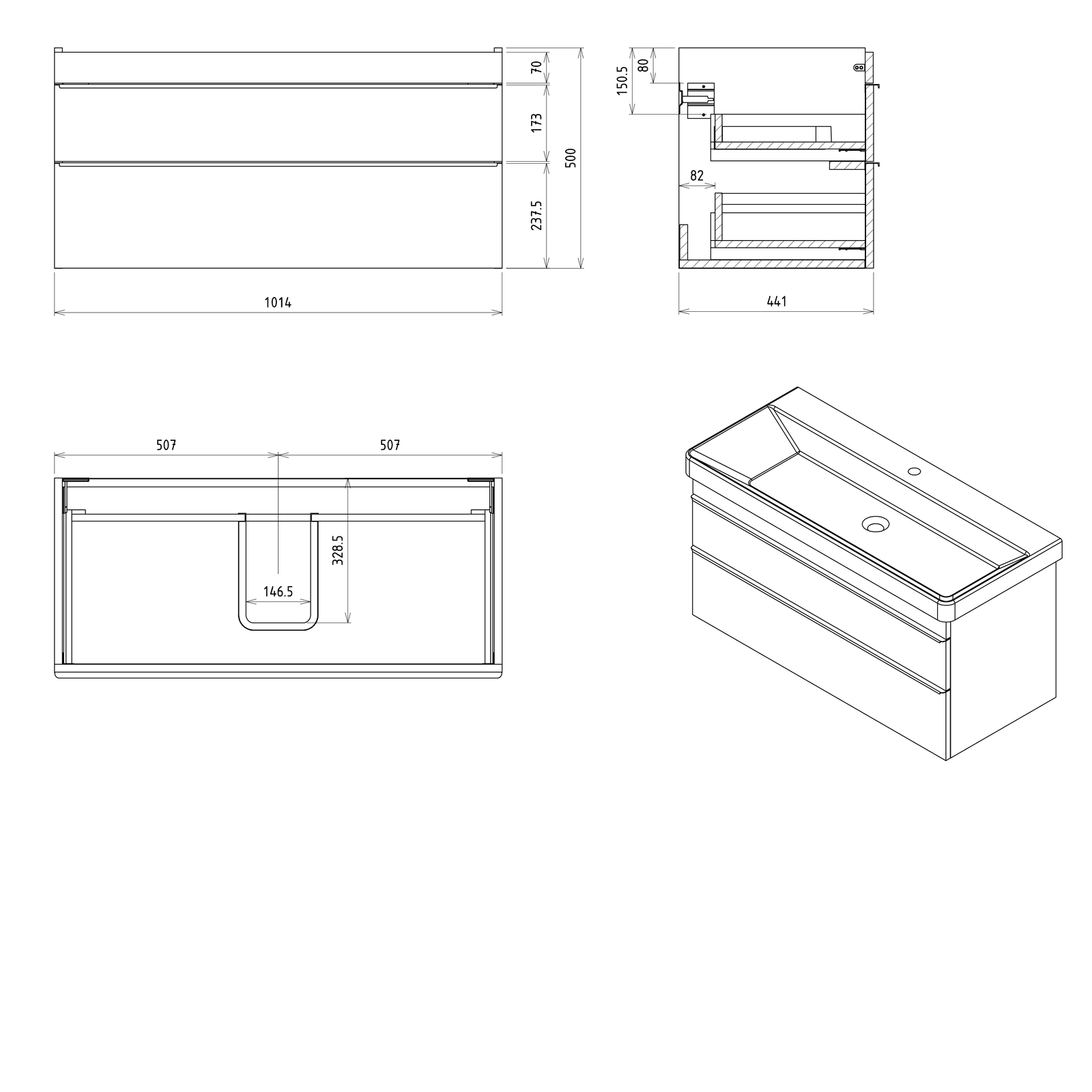 Szuflady wyposażone są w pojazdy z cichym domykiem, drzwiczki posiadają zawiasy zwalniające. Uchwyty są dostępne w kolorach czarny mat i biały mat.