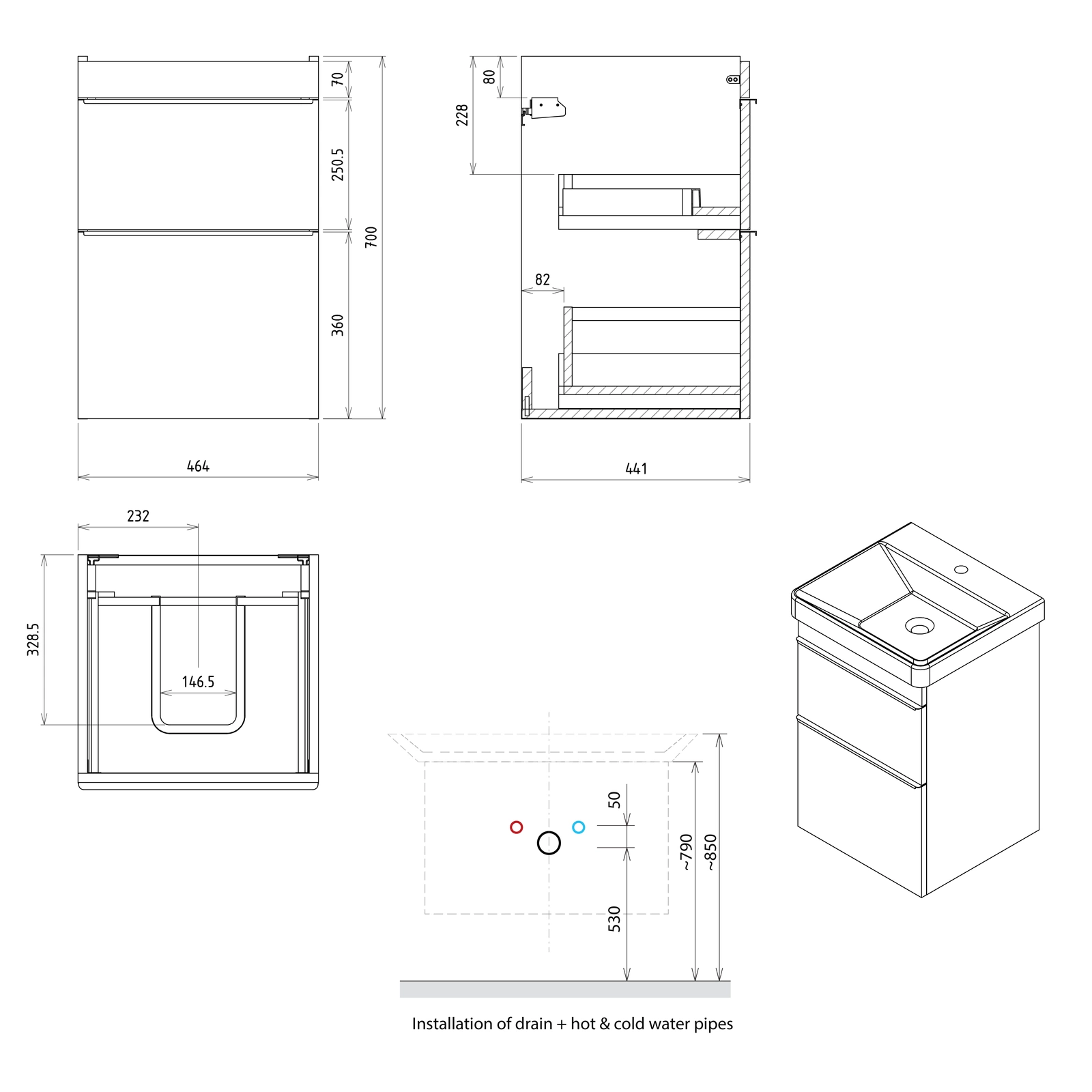 Szuflady wyposażone są w pojazdy z cichym domykiem, drzwiczki posiadają zawiasy zwalniające. Uchwyty są dostępne w kolorach czarny mat i biały mat.
