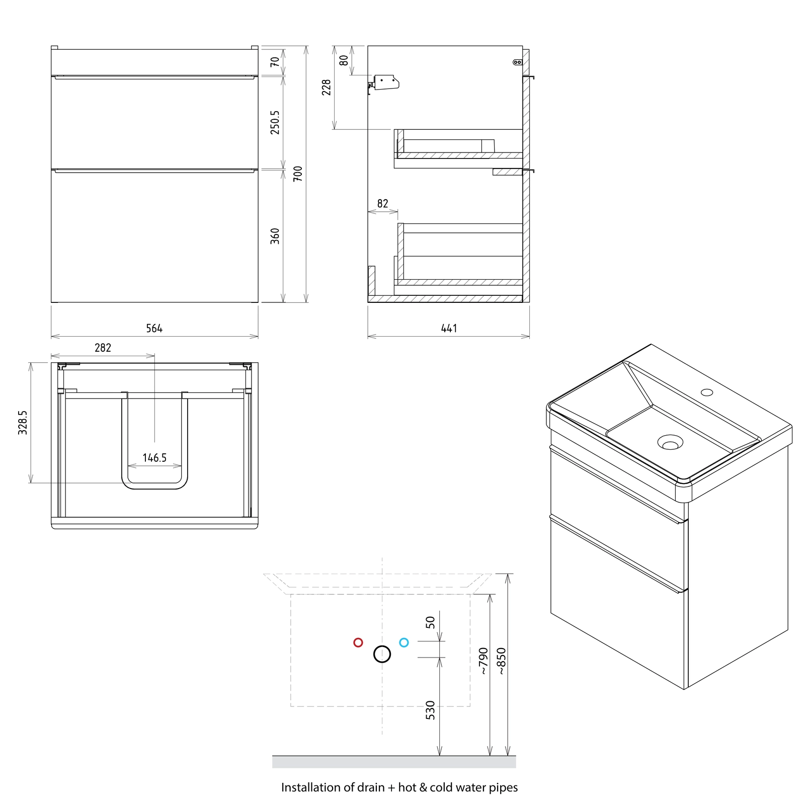 SITIA szafka umywalkowa 56,4x70x44,2cm, 2 szuflady, sosna rustykalna