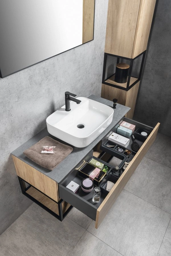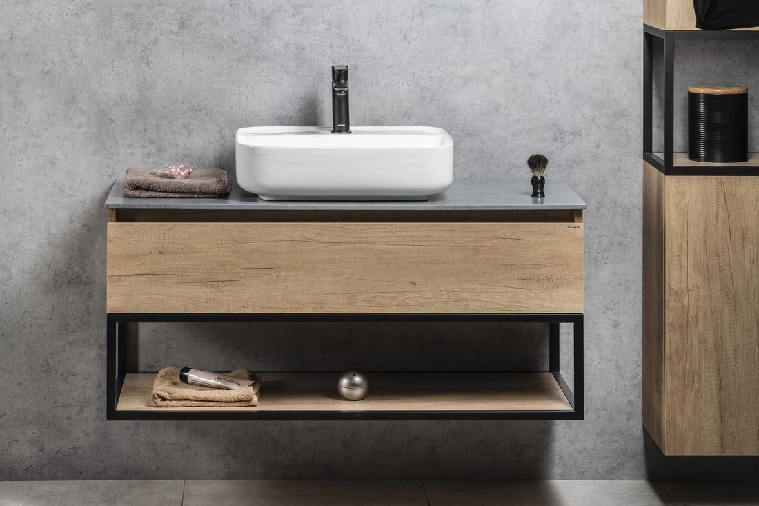 Profile konstrukcji wykonane są w kolorze czarny mat, dodatkowa szuflada wykonana jest z płyt MDF laminowanych w dekorze dąb Collingwood albo dąb Alabama. Szuflada nie ma uchwytów, co podkreśla prosty design i wyposażona jest w system Soft close do automatycznego zamykania szuflady. Konstrukcje podwieszane przeznaczone są do umywalek kompozytowych TWIG w kolorze białym. Konstrukcje o szerokości 80 i 100 cm są asymetryczne z praktycznym miejscem do przechowywania rzeczy. Oferujemy również wariant konstrukcji stojącej pod umywalką betonową FORMIGO, którą oferujemy w kilku dekorach.