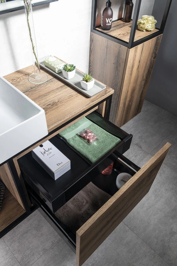 Profile konstrukcji wykonane są w kolorze czarny mat, dodatkowa szuflada wykonana jest z płyt MDF laminowanych w dekorze dąb Collingwood albo dąb Alabama. Szuflada nie ma uchwytów, co podkreśla prosty design i wyposażona jest w system Soft close do automatycznego zamykania szuflady. Konstrukcje podwieszane przeznaczone są do umywalek kompozytowych TWIG w kolorze białym. Konstrukcje o szerokości 80 i 100 cm są asymetryczne z praktycznym miejscem do przechowywania rzeczy. Oferujemy również wariant konstrukcji stojącej pod umywalką betonową FORMIGO, którą oferujemy w kilku dekorach.
