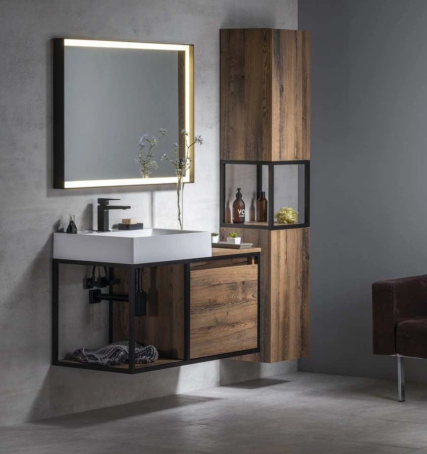 Konstrukcje z serii SKARA nadają się do łazienek urządzonych w nowoczesnym i industrialnym stylu. Chłodny aspekt czarnego metalu jest gustownie uzupełniony o element ocieplający w postaci drewna z mocno podkreślonymi słojami. Typowa koncepcja industrialna z umywalką FORMIGO ma swój odpowiednik w delikatniejszej wersji z umywalką TWIG. Konstrukcje SKARA doskonale uzupałniają meble TREOS lub podświetlane lustra SORT w czarnej aluminiowej ramie.