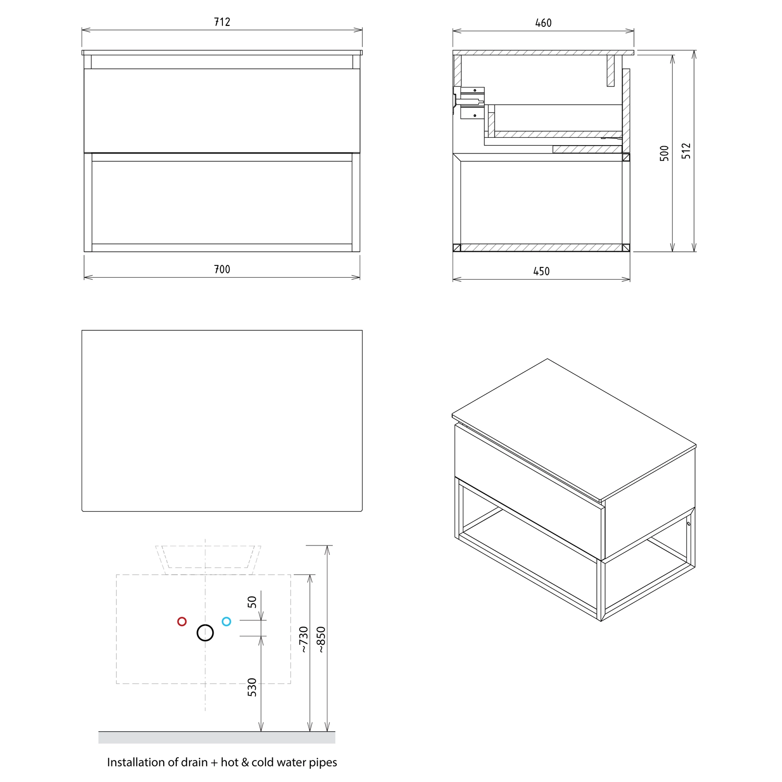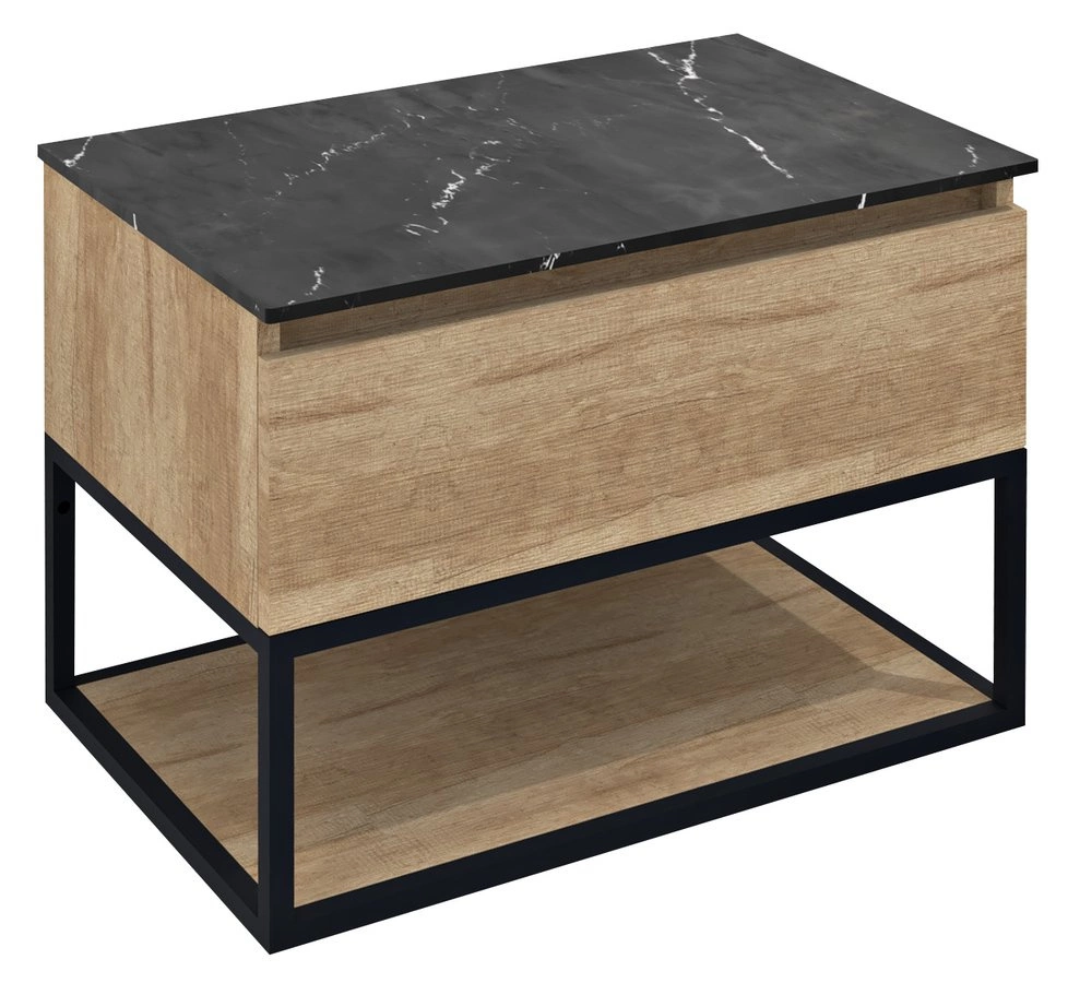 Profile konstrukcji wykonane są w kolorze czarny mat, dodatkowa szuflada wykonana jest z płyt MDF laminowanych w dekorze dąb Collingwood albo dąb Alabama. Szuflada nie ma uchwytów, co podkreśla prosty design i wyposażona jest w system Soft close do automatycznego zamykania szuflady. Konstrukcje podwieszane przeznaczone są do umywalek kompozytowych TWIG w kolorze białym. Konstrukcje o szerokości 80 i 100 cm są asymetryczne z praktycznym miejscem do przechowywania rzeczy. Oferujemy również wariant konstrukcji stojącej pod umywalką betonową FORMIGO, którą oferujemy w kilku dekorach.