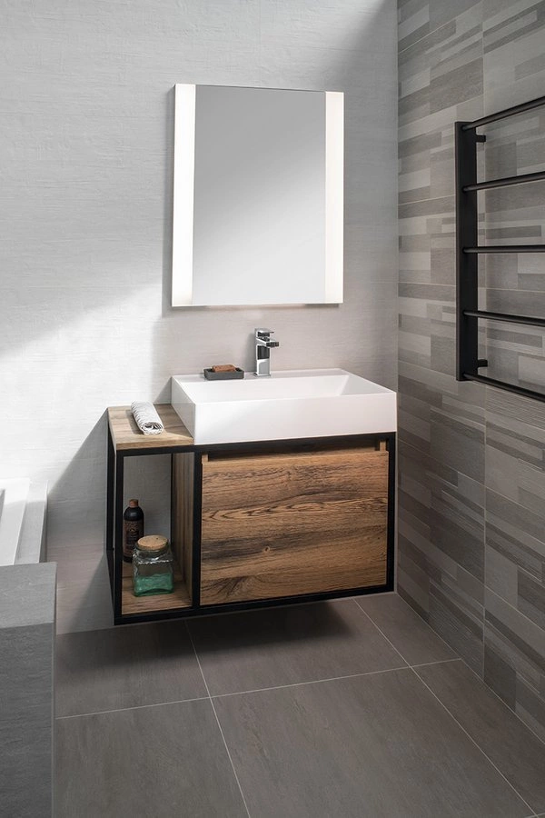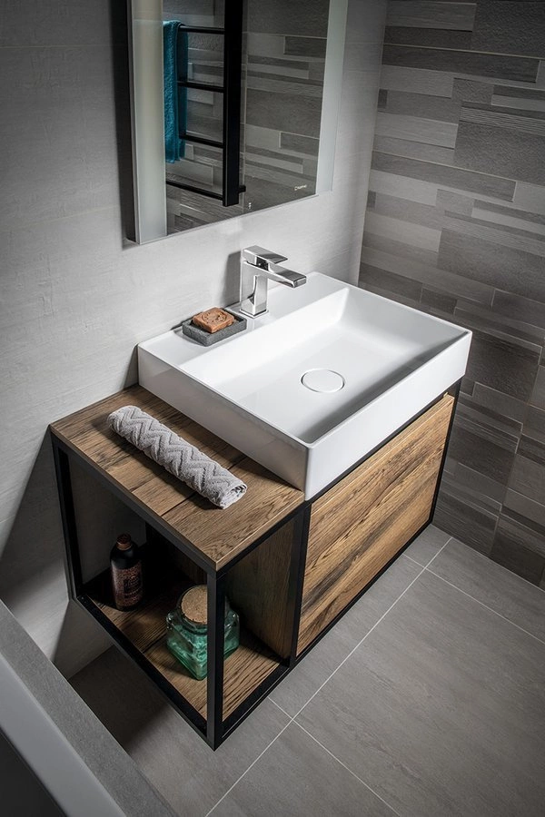 Konstrukcje z serii SKARA nadają się do łazienek urządzonych w nowoczesnym i industrialnym stylu. Chłodny aspekt czarnego metalu jest gustownie uzupełniony o element ocieplający w postaci drewna z mocno podkreślonymi słojami. Typowa koncepcja industrialna z umywalką FORMIGO ma swój odpowiednik w delikatniejszej wersji z umywalką TWIG. Konstrukcje SKARA doskonale uzupałniają meble TREOS lub podświetlane lustra SORT w czarnej aluminiowej ramie.