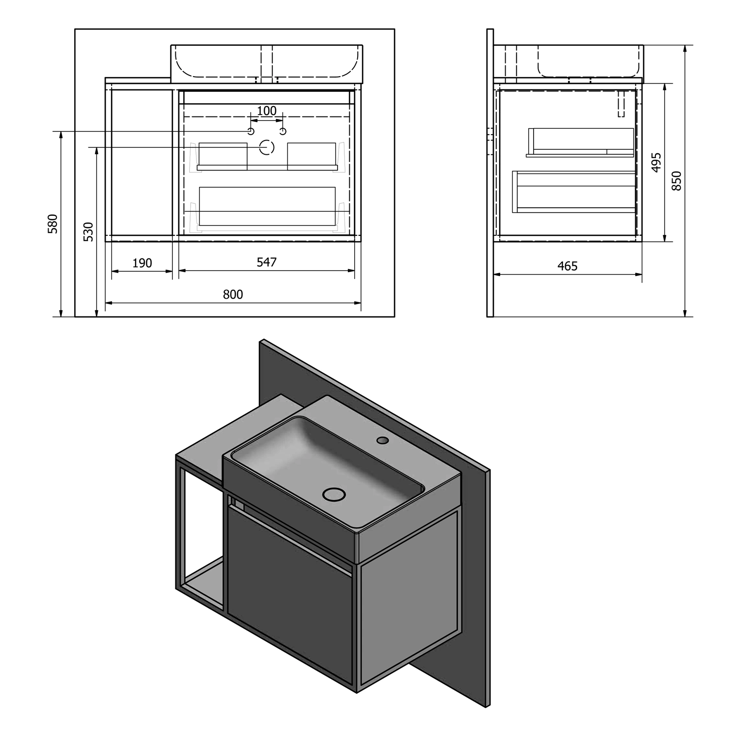 Profile konstrukcji wykonane są w kolorze czarny mat, dodatkowa szuflada wykonana jest z płyt MDF laminowanych w dekorze dąb Collingwood albo dąb Alabama. Szuflada nie ma uchwytów, co podkreśla prosty design i wyposażona jest w system Soft close do automatycznego zamykania szuflady. Konstrukcje podwieszane przeznaczone są do umywalek kompozytowych TWIG w kolorze białym. Konstrukcje o szerokości 80 i 100 cm są asymetryczne z praktycznym miejscem do przechowywania rzeczy. Oferujemy również wariant konstrukcji stojącej pod umywalką betonową FORMIGO, którą oferujemy w kilku dekorach.