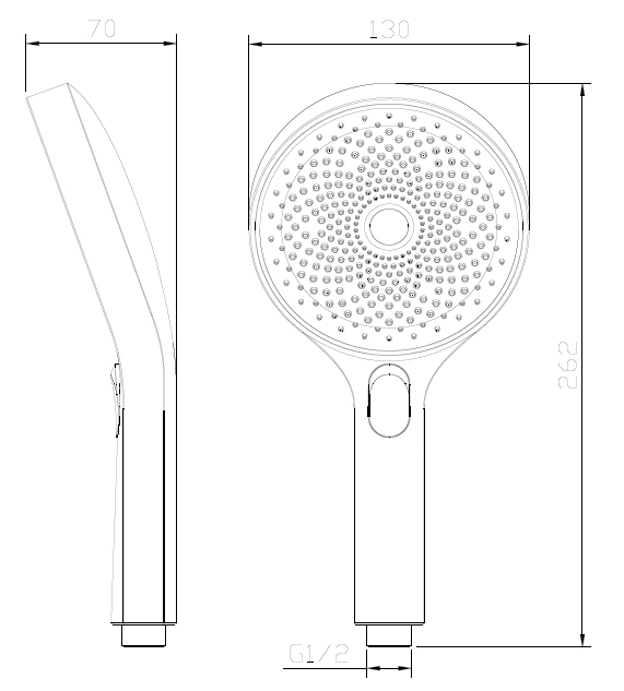 - Wymiary: długość ok. 262 mm, średnica głowicy ok. 130 mm, głębokość ok. 70 mm.