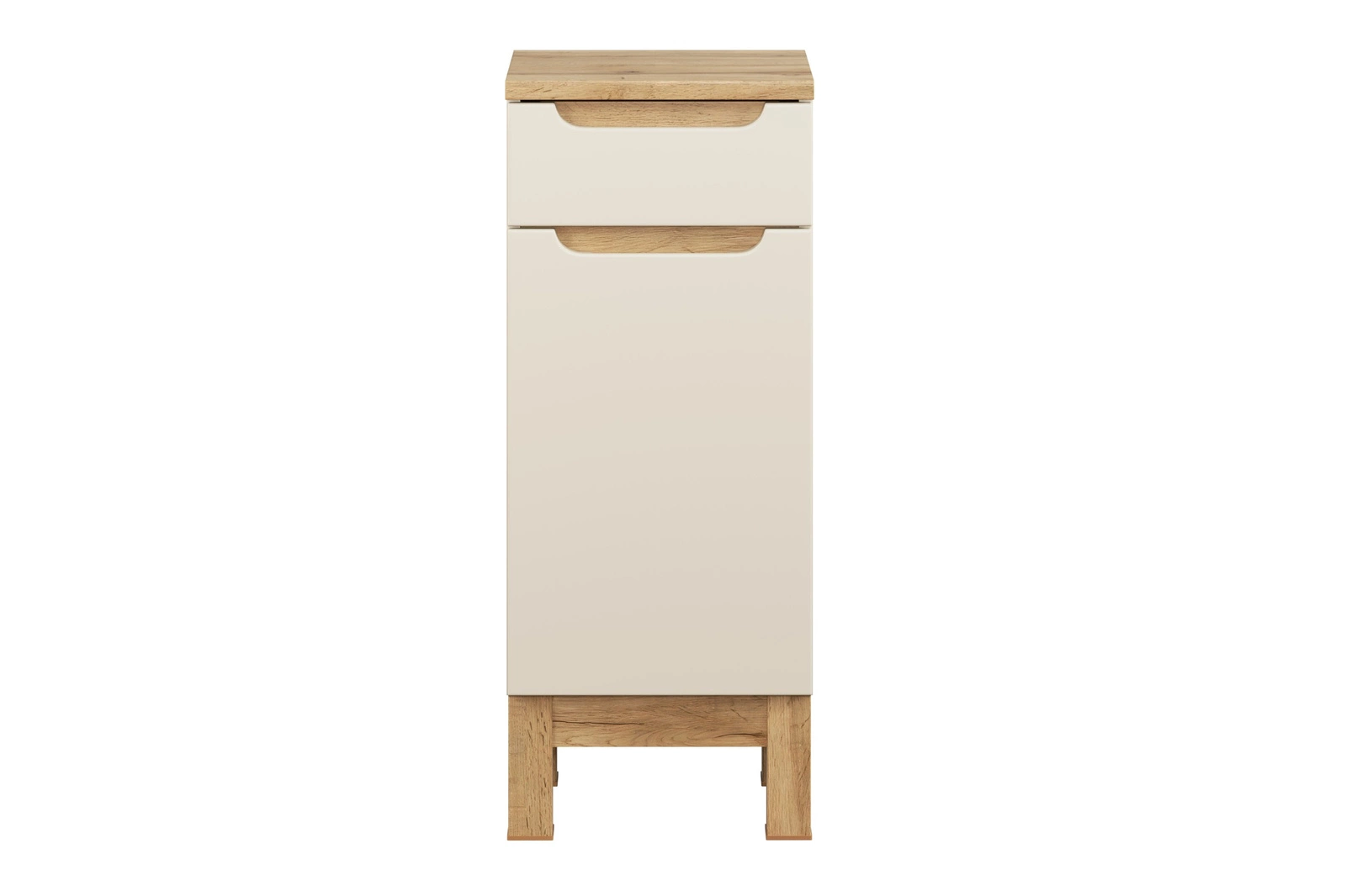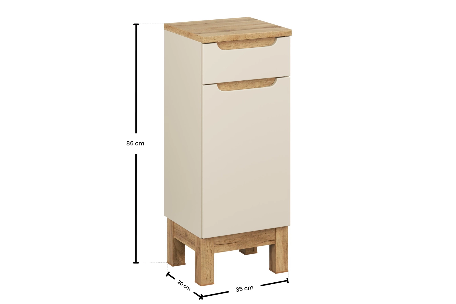 Szafka boczna o szerokości 35cm z kolekcji Bali Cashmere otula wnętrze ciepłem i spokojem, tworząc przestrzeń, w której chce się zatrzymać na dłużej. Jasny dekor Kaszmirowy Beż w duecie z naturalnym dekorem Dąb Wotan tworzy spójną, elegancką całość. Smukłe, stabilne nogi subtelnie unoszą bryły, dodając im lekkości, a gładkie fronty z zintegrowanymi podchwytami podkreślają nowoczesny, a zarazem ponadczasowy charakter mebli.