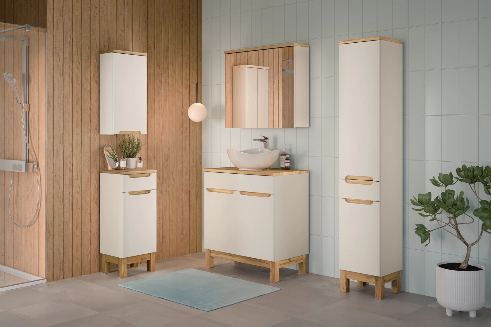 Dzięki dwóm pojemnym półkom i praktycznej szufladzie, szafka oferuje zaskakująco dużą przestrzeń do przechowywania w kompaktowej formie, zapewniając wygodną organizację przestrzeni w łazience. Meble wykonane z płyty MDF i płyty laminowanej zachwycają trwałością i estetyką na lata. Komfort codziennego użytkowania zapewnia system cichego domykania drzwi i szuflad. To idealny wybór dla tych, którzy cenią połączenie funkcjonalności z wyrafinowanym stylem.