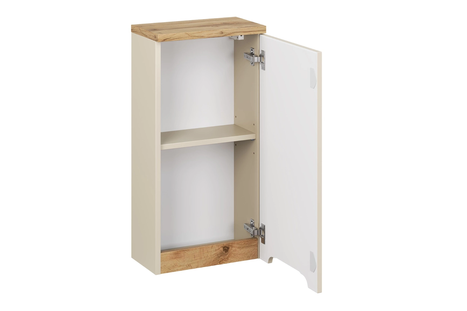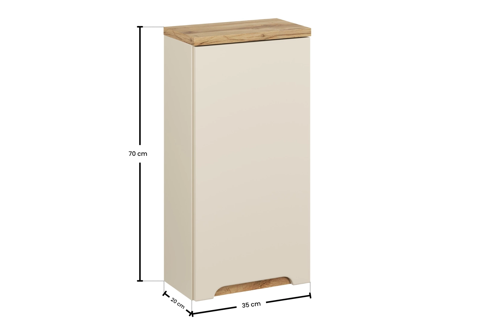 Szafka górna o szerokości 35cm z kolekcji Bali Cashmere otula wnętrze ciepłem i spokojem, tworząc przestrzeń, w której chce się zatrzymać na dłużej. Jasny dekor Kaszmirowy Beż w duecie z naturalnym dekorem Dąb Wotan tworzy spójną, elegancką całość. Gładkie fronty z zintegrowanymi podchwytami podkreślają nowoczesny, a zarazem ponadczasowy charakter mebli.