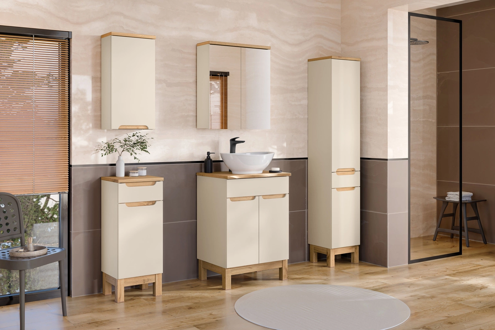 Dzięki dwóm pojemnym półkom, szafka oferuje zaskakująco dużą przestrzeń do przechowywania w kompaktowej formie, zapewniając wygodną organizację przestrzeni w łazience. Meble wykonane z płyty MDF i płyty laminowanej zachwycają trwałością i estetyką na lata. Komfort codziennego użytkowania zapewnia system cichego domykania drzwi. To idealny wybór dla tych, którzy cenią połączenie funkcjonalności z wyrafinowanym stylem.