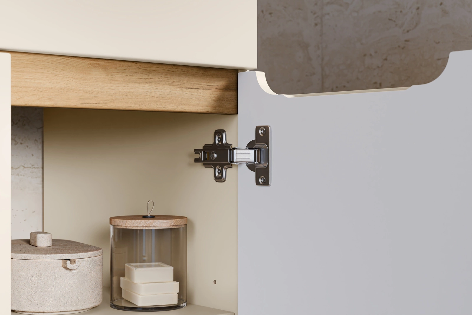 Szafka pod umywalkę o szerokości 80cm z kolekcji Bali Cashmere otula wnętrze ciepłem i spokojem, tworząc przestrzeń, w której chce się zatrzymać na dłużej. Jasny dekor Kaszmirowy Beż w duecie z naturalnym dekorem Dąb Wotan tworzy spójną, elegancką całość. Smukłe, stabilne nogi subtelnie unoszą bryły, dodając im lekkości, a gładkie fronty z zintegrowanymi podchwytami podkreślają nowoczesny, a zarazem ponadczasowy charakter mebli.