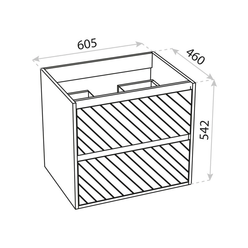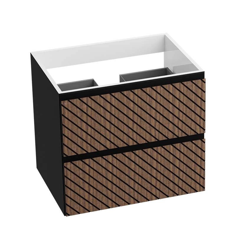 Mebel Toronto 60 cm to połączenie elegancji, praktyczności i nowoczesnego wzornictwa w kompaktowej formie idealnej do mniejszych łazienek, toalet czy wnętrz, gdzie liczy się każdy centymetr przestrzeni. Czarna konstrukcja w połączeniu z frontami w dekorze drewna z skośnym wzorem tworzy harmonijny i designerski element wyposażenia, który wprowadza ciepło i luksusowy charakter do wnętrza.