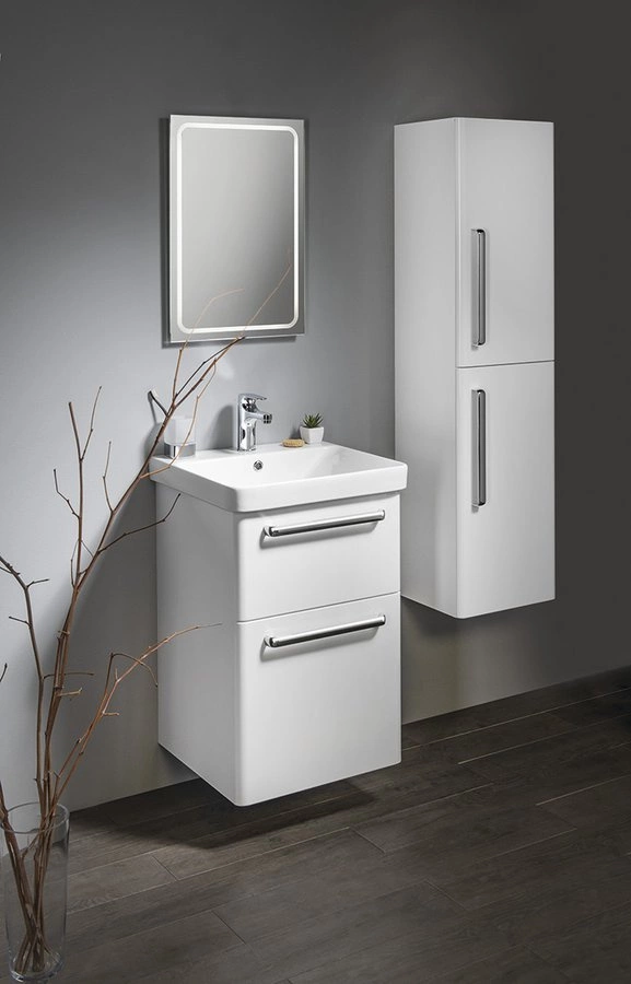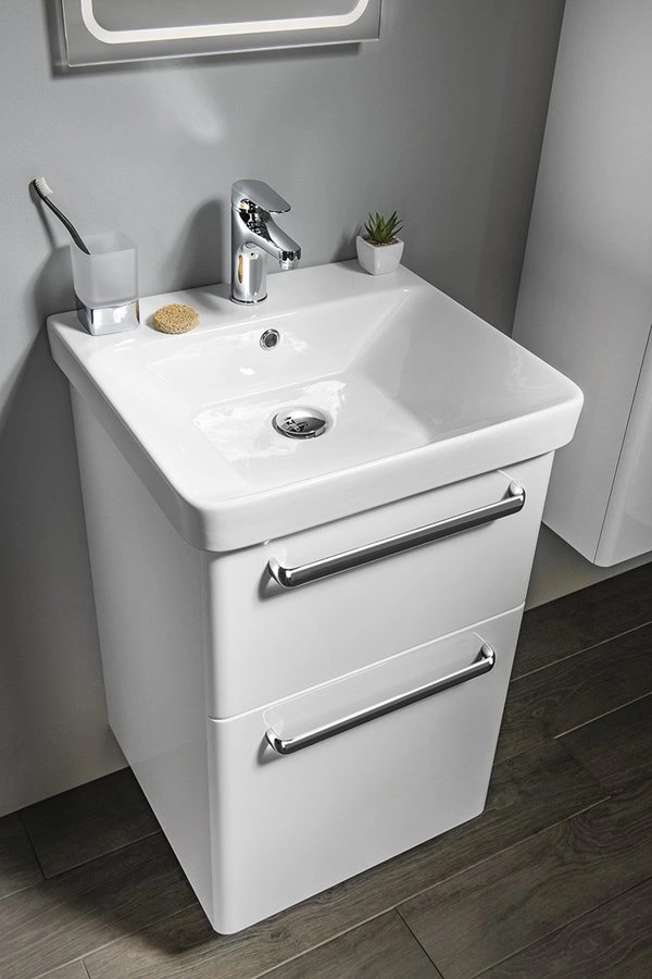 Nowoczesna linia szafek z serii THEIA podkreślona efektownymi uchwytami doskonale współgra z umywalkami ceramicznymi THALIE tworząc ponadczasowy komplet, który pasuje do każdej nowoczesnej łazienki. Kontury są wzajemnie dopasowane tworząc czysty i schludny wygląd całości.