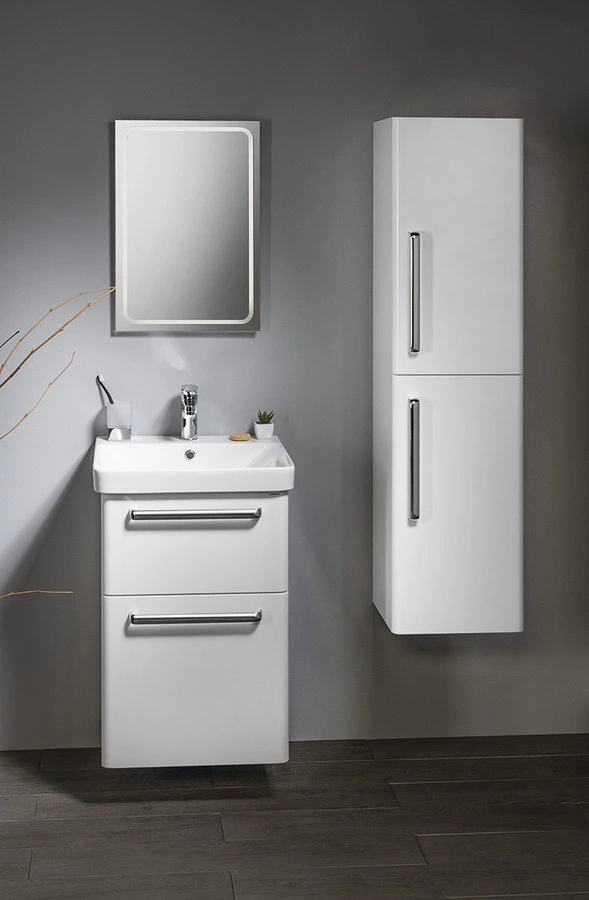 Szuflady wyposażone są w prowadnice marki BLUM ® z dożywotnią gwarancją, drzwiczki wyposażone są w zawiasy ze zintegrowanym systemem zamykania. W ofercie mamy szafki pod umywalkę z szufladami lub drzwiczkami oraz wysoki słupek w dwu wymiarach. Szufladę szafki umywalkowej o szerokości 80 cm można dodatkowo wyposażyć praktycznym organizerem, do słupka o szerokości 35 cm polecamy tkaninowy kosz na bieliznę. Meble z serii Theia są dostępne w kolorze biały połyk oraz w dwu dekorach w wersji laminowanej.