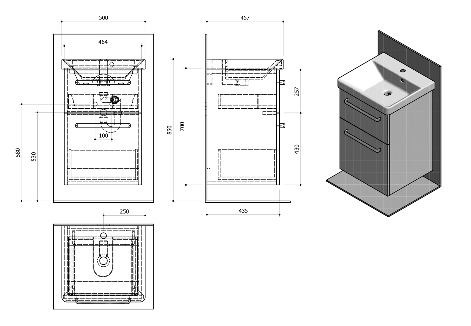 THEIA Szafka umywalkowa 46,4x70x44,2cm, 2 szuflady, dąb srebrny